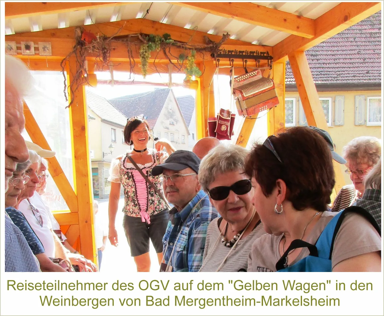 Die Fahrt ging weiter zu der lieblichen Weinbaugemeinde Bad Mergentheim-Markelsheim, wo wir uns zunächst mit einem kräftigen Mittagessen stärkten. Danach wurden wir von einem stattlichen, schleppergezogenen „Gelben Wagen“ abgeholt, auf dem alle Reiseteilnehmer Platz finden konnten. Nun begann eine fröhliche Fahrt durch die Weinberge: Wir wurden gleich mit Weingläsern und Liederbüchlein „ausgestattet“ und unsere Begleiterin Conny L. – einst Weinkönigin – stimmte mit ihrem Akkordeon lustige Lieder an.