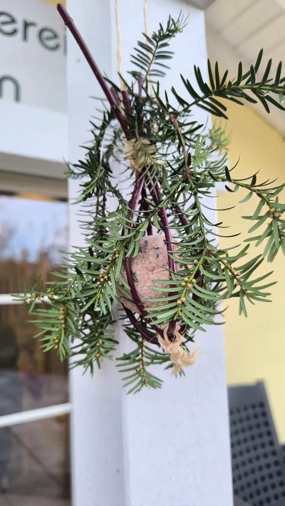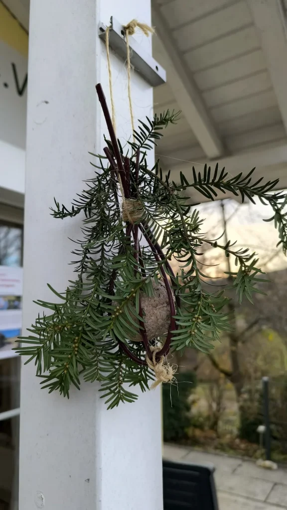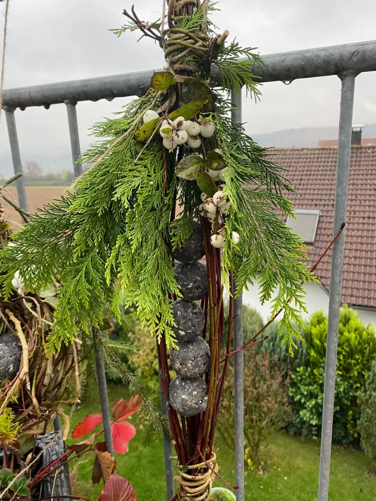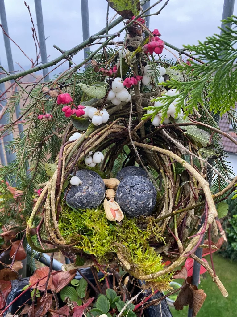 Natürliche Materialien, wie wir sie genutzt haben – Zweige, Moos, Beeren, Zapfen – sind nicht nur dekorativ, sondern bieten Vögeln zusätzlich Deckung und wirken wie kleine natürliche Futterstationen.