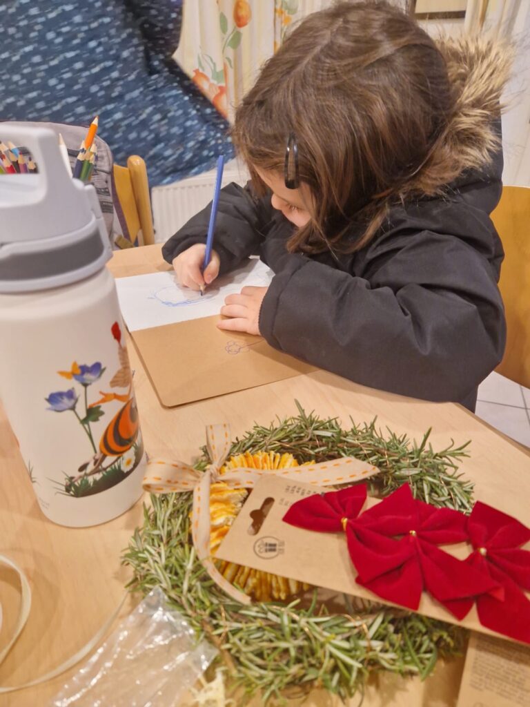 Unsere kleinen Gärtner:innen haben mit viel Spaß frischen Rosmarin geschnitten, Orangenschalen getrocknet und daraus herrlich duftende Kränze geflochten. Mit Gummiband oder Draht fixiert – ein einfaches Bastelabenteuer, das die Sinne weckt und kreative Hände beschäftigt.